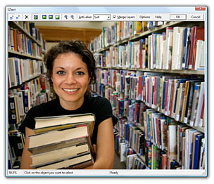 This refines the selection so just the woman's face is selected. Each time you click, the selection is immediately changed, so it's very easy to place the next marker. Calculating the new selection typically takes less than a second for a 10-megapixel photo. And while EZlect is calculating in the background, you can just continue to place new markers. |