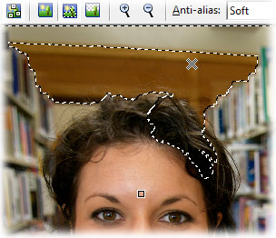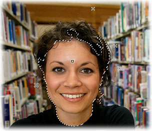 Immediately after you place a new marker, EZlect recalculates and shows the resulting selection. As you can see in the screen shot, EZlect always picks an edge between the object and background markers. In this case, everything gets selected except for a small area around the background marker above the woman's head. |